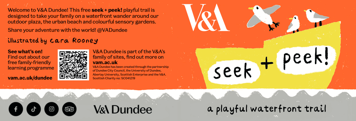 Welcome to V&A Dundee! This free seek + peek! playful trail is designed to take your family on a waterfront wander around our plaza, the urban beach and gardens.
